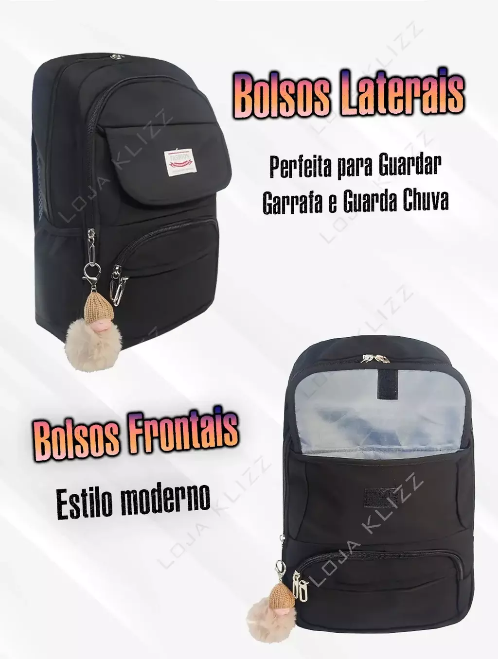 - 2 Bolsos Laterais para Garrafa e Guarda Chuva